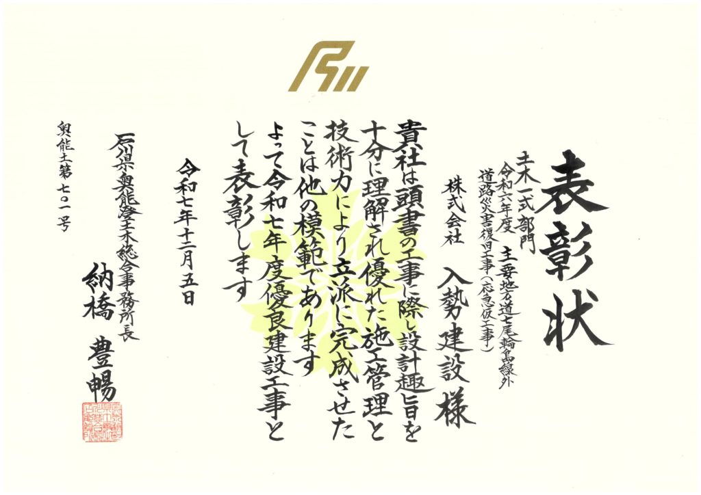 石川県奥能登土木総合事務所長より、令和七年度優良建設工事を受賞しました。